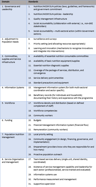 Developing these performance standards was the most important step in the SUN LE PA design process.The Scaling Up Nutrition program is huge and wide-ranging, involving six different government ministries and impacting millions of Zambian households. Hence, the PA included 31 different performance standards grouped across 8 domains.